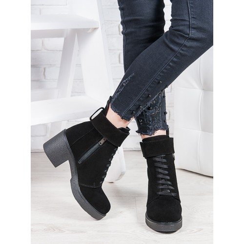 Застегивается на молнию, а  ремешок и шнуровка помогает идеально лечь модельке по ножке.