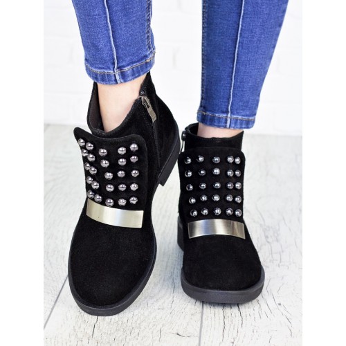 Ботинки выполнены из качественной натуральной черной замши. Стильный пошив, натуральный материал подарит комфорт и прекрасный внешний вид. Декорирована металлическими бусинами.
